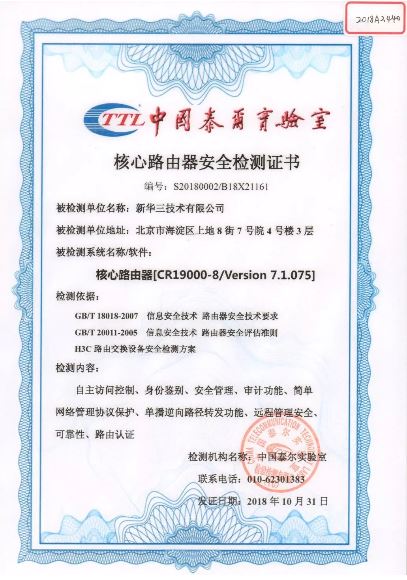 新華三CR19000-8核心路由器獲得泰爾系統實驗室首張網絡設備安全檢測證書